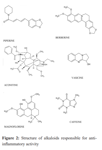 In contrast to synthetic agents, the herbal medicines containing alkaloids offer a promising alternative by providing a more natural and balanced modulation of inflammatory pathways. Although alkaloids are potent bioactive compounds with inherent toxicity, their use in traditional medicine shows that they can be safe and effective when used in controlled dosages. The alkaloidal compounds have been classified into various categories based on their biosynthetic precursor and heterocyclic ring system. The basic moiety such as indole, piperidine, tropane, purine, pyrrolizidine, imidazole, quinoline, isoquinoline, and pyrrolidine type of alkaloids were found. They are widely distributed in families such as Solanaceae, Rubiaceae, Ranunculaceae, Apocynaceae, Papaveraceae.9 Alkaloids occur naturally as salts of organic acids such as tartrates, maleates, citrates, oxalates and sulfamates. Morphine, strychnine, quinine, ephedrine, nicotine, etc., are well-known alkaloids used in clinical practice.10,11