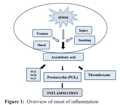 The term "inflammation", derived from the Latin word "Inflammare" (to set on fire), describes a complex biological response initiated by vascular tissue in reaction to harmful stimuli such as pathogens, irritants, and damaged cells.1 The process of inflammation involves various chemical mediators, including prostaglandins, prostacyclin, leukotrienes, lymphokines, and chemokines. Specific inflammatory mediators like interleukin (IL)-1β, IL-6, histamine, 5-hydroxytryptamine (5-HT) and tumor necrosis factor-α (TNF-α) were found to be elevated (Figure 1) in inflammatory conditions. These mediators induce vasodilation and increase vascular permeability, thereby attracting leukocytes. The resulting process of inflammation causes oedema due to the leakage of fluid and proteins from the vascular tissue. Inflammation manifests as pain, redness, warmth and swelling. Vasodilation increases the blood flow, causing redness and warmth while sensitized nerve endings contribute to pain. Inflammation is crucial for healing and immune defence, dysregulation of which can lead to chronic inflammatory disorders. Chronic systemic inflammation is a primary contributor to a number of disorders, including asthma, diabetes, and cancer, thereby necessitating further research into novel potential therapies.2-3