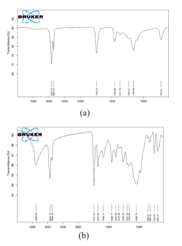 Fourier Transform Infrared Spectroscopy (FTIR - Bruker alpha, Chitradurga) was used to identify functional groups in the oil and cones. Samples were scanned between 4000-400 cm⁻¹. Characteristic peaks corresponding to alcohols (3400 cm⁻¹), esters (1735 cm⁻¹), and alkenes (1650 cm⁻¹) indicated the presence of terpenoids and phorbol esters.15
