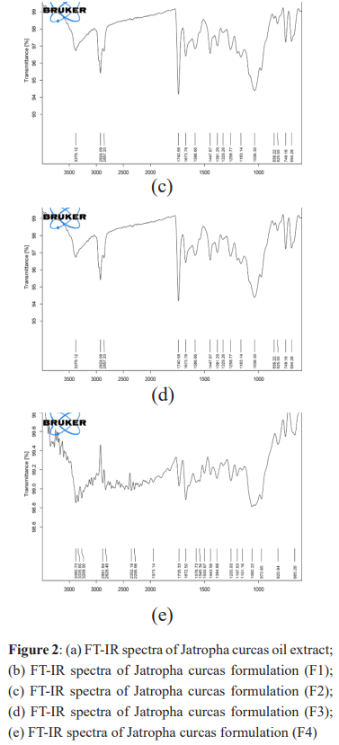Spectroscopic analysis using FTIR (Fourier Transform Infrared Spectroscopy) confirmed the presence of functional groups such as hydroxyls, esters, and alkenes, typically associated with terpenoids and esters in plant extracts. These compounds are believed to exert neurotoxic and behavioural effects on mosquitoes by disrupting olfactory receptors and neurotransmission pathways, as reported in previous studies on Anopheles and Aedes species.9,18 The FTRI results suggest the presence of phorbol esters and terpenoids, consistent with the plant’s known phytochemistry.20