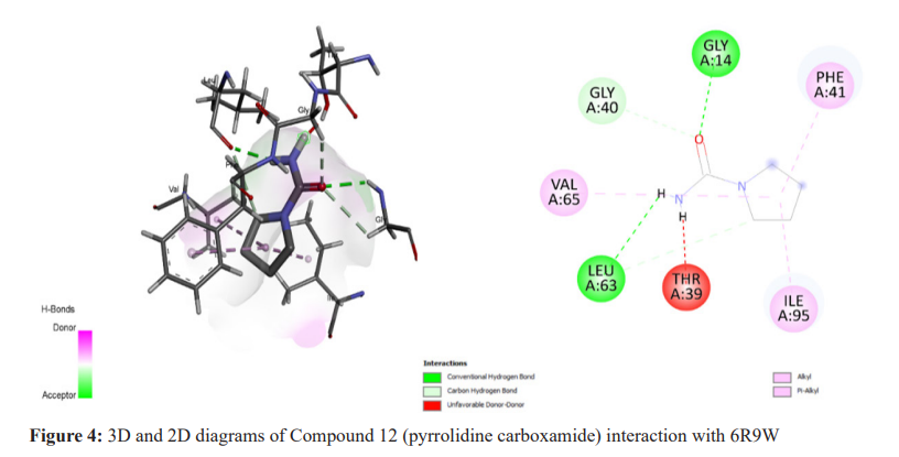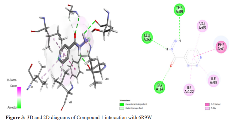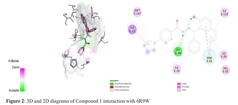 The molecular docking technique was used to investigate, predict, and comprehend the protein or enzyme interactions with the specified ligand library, and to visualise the likely binding. Pyrrole derivatives were docked with receptors (6R9W) using Biovia Discovery Studio, the virtual screening tool which used Autodock Tool 1.5.6. Binding energies and interacting residues were discovered and are summarized in Table 2. The selected compound with the highest docking energy (Compound 1) and the reference compounds are illustrated in 3D and 2D diagrams with protein 6R9W (Figure 2-4).