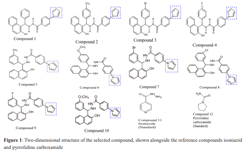 Conclusion: Compound 1, with the IUPAC name N'-((2-hydroxynaphthalen-1-yl) (phenyl)methyl)-4-(1Hpyrrol-1-yl) benzohydrazide, is an excellent candidate for the cell wall protein inhibitor (6R9W). It exhibited a strong docking affinity, with a binding energy of -11.1 kcal/mol. Using an in-silico drug design approach, the study highlights the effectiveness of pyrrole scaffolds as enoyl-acyl carrier protein (ACP) reductase (InhA) antagonists in novel antitubercular therapies.