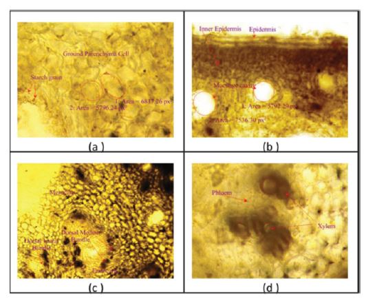 The microscopic evaluation of A. esculentus, commonly referred to as okra or lady's finger, involves the examination of its internal cellular structures and tissues. Such evaluation is importantin botanical research and quality control, as it provides valuable information about the fruit's anatomy and can be essential for various research and quality control purposes. Photomicrographs taken at various magnifications help in documenting the microscopic structures and cellular details of A. esculentus fruit.5-7