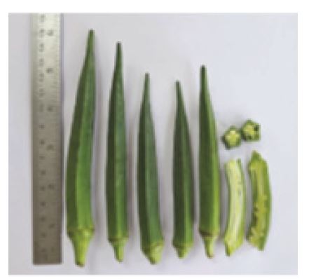 Okra (Abelmoschus species) belongs to the Malvaceae family. The genus Abelmoschus originated in Central Africa but is now cultivated throughout tropical and subtropical zones globally. They may be annual herbs, perennial shrubs, or trees, and they characteristically produce a mucilaginous substance. Several types of okra exist, including A.moshatus, A. manihot, A.esculentus, A.tuberculatus, A.ficulneus, A.crinitus, A. angulosus, and A.caillei. This study focused on the species A.esculentus. Notable morphological differences among species include variations in plant size, pod shape, length, and diameter.1